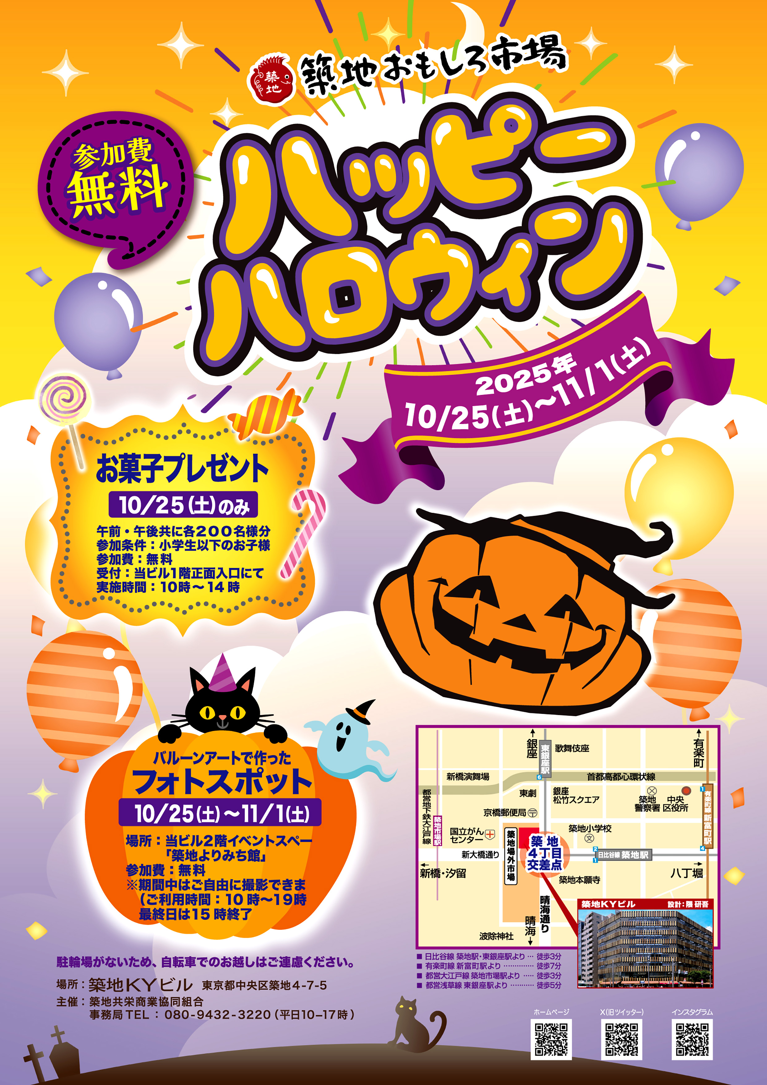 #築地おもしろ市場 #ハッピーハロウィン 10/23(土)~31(土)の期間中、築地KYビルの正面入口をバルーンデコレーションで飾ります‼ お買物・お散歩の際にぜひお楽しみください。