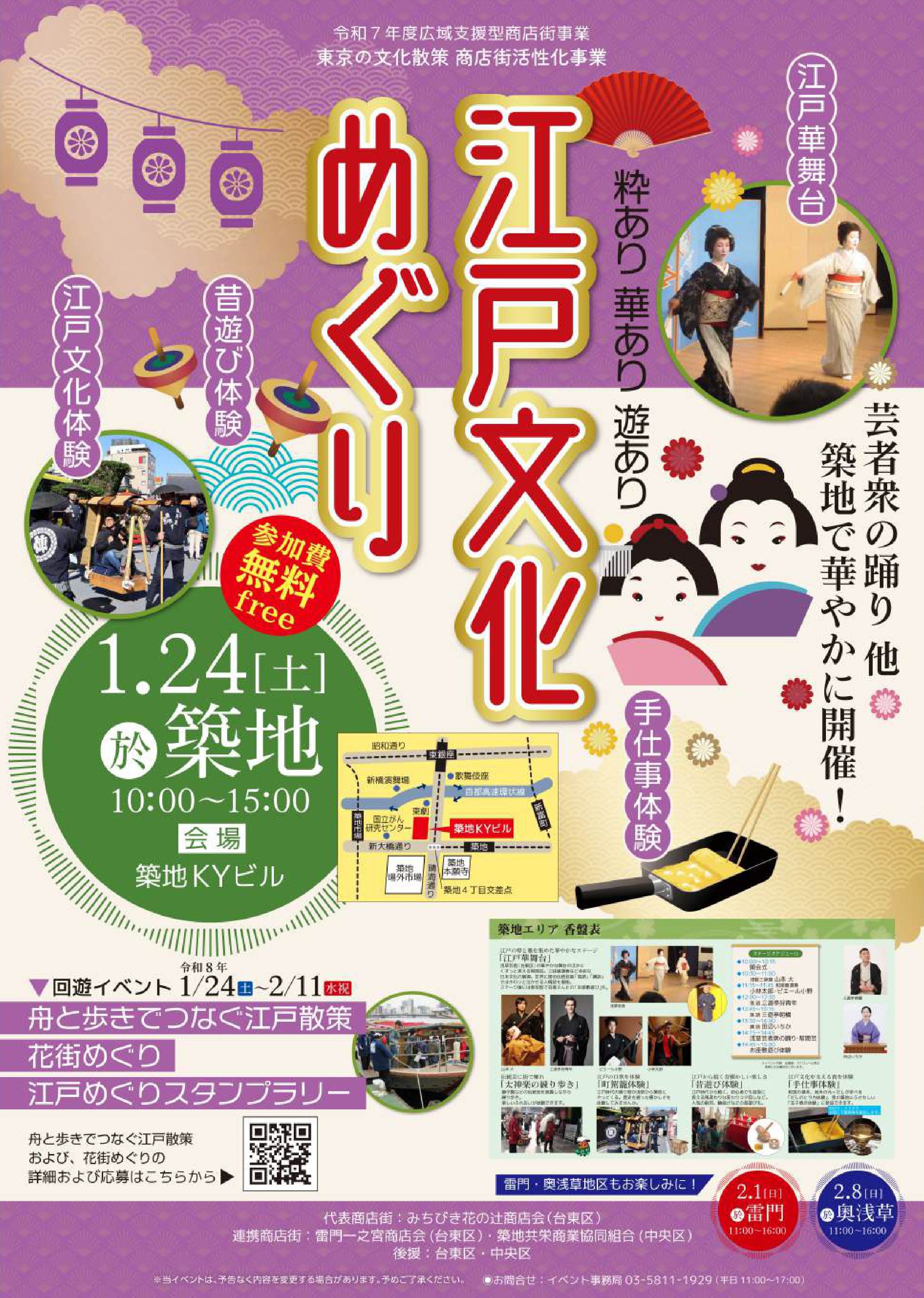 浅草の商店街と合同で行うイベント『江戸の華まつり』は、ともに江戸時代から伝統のある地域同志で手を組み、合同で賑やかなイベントメニューを豊富にご用意しています。築地会場は築地KYビルで1月25日(土)に開催します。参加費は無料ですので、この機会に伝統芸能や伝統工芸、文化にふれて、参加して、楽しんでみてはいかがでしょうか。ドラマでも盛り上がっている江戸文化を再発見できるかもしれませんよ! 1月18日(土)・19日(日)は浅草でも開催します。【日時】2025年01月25日(土) 10:00~15:00【場所】築地KYビル【内容】浮世絵展、伝統芸能鑑賞…太神楽、女木造り、二調鼓、落語等、伝統工芸体験…浮世絵版画手刷り、お寿司のミニチュア作り、伝統文化体験…射的、スマートボール ※イベント内容は予告なく変更する場合があります。予めご了承ください。【主催】吉原商店会(台東区)・一葉桜開運振興会(台東区)・築地共栄商業協同組合(中央区)【後援】台東区・中央区【お問合わせ】イベント事務局 TEL:03-5811-1929(11:00~17:00)